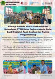 Pangkalpinang, 23 November 2025— Mahasiswa Praktik Pengalaman Lapangan (PPL) dan Kuliah Kerja Nyata (KKN) STAB Maha Prajna Jakarta berkolaborasi dengan Remaja Buddhis Vihara Sukhavati Pangkalpinang menggelar kegiatan bakti sosial di Panti Asuhan Nur Rahma Pangkalpinang, pada [isi tanggal kegiatan]. Kegiatan ini menjadi wujud nyata kepedulian sosial sekaligus implementasi nilai-nilai ajaran Buddha dalam kehidupan bermasyarakat.